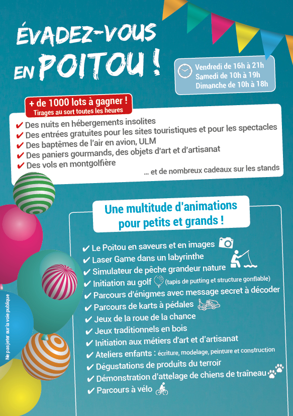 Le salon réunit plus de 150 activités de loisirs et valorise les richesses touristiques du Poitou et ses environs! Vous pourrez rencontrer de nombreux prestataires et sélectionner des idées pour vos prochains week-ends ou activités.