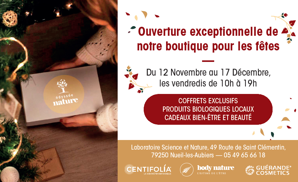 Venez découvrir toutes nos idées cadeaux en profitant de l’ouverture en accès libre de notre boutique Odyssée Nature tous les Vendredis du 12 Novembre au 17 Décembre. Vous pourrez notamment y retrouver les produits Body Nature ainsi que plusieurs gammes de nos marques Centifolia et Guérande Cosmetics.